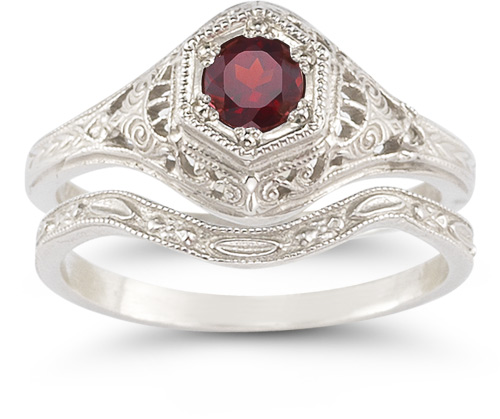 Beautiful antique-style Gemstone Engagement Ring Set in 14k solid white gold with a genuine 4.5mm Ruby. Also available in yellow gold, 18k gold, or platinum, by request. Gemstone Characteristics Gemstone Type: Ruby Gemstone Size: 4.5mm Gemstone Shape: Round Gemstone Quality: AA+ Ring Measurements Engagement Ring Width: 2mm Engagement Ring Setting Height: 4mm (just under 3/16") Widest point on face of ring: 10mm (3/8") Wedding Band Width: 2mm Total Set Width on Finger: 4mm Gold Characteristics Gold Karat: 14K White Gold Gold Weight: 4.20 Grams