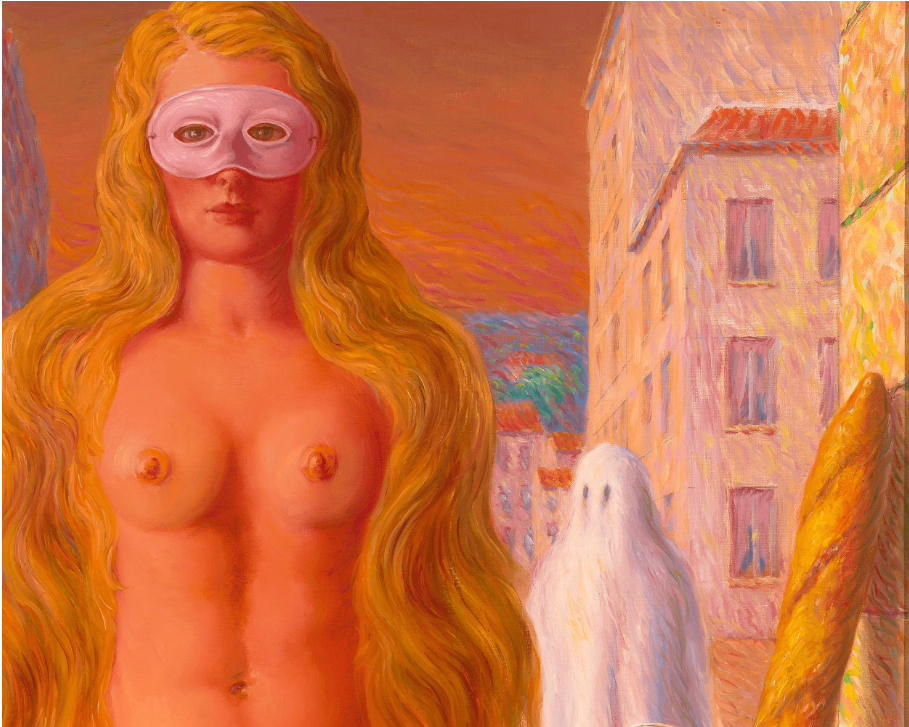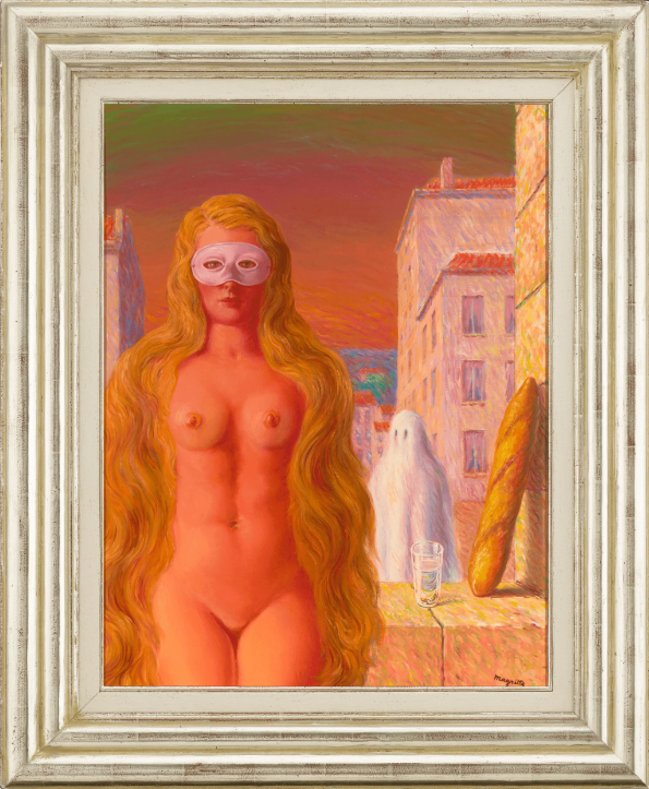 This enigmatic painting was composed by the great Belgian Surrealist René Magritte It is a tour-de-force example of the haunting, mysterious scenes that comprise his oeuvre Entitled Le carnaval du sage, the oil showcases several of Magritte's recurring themes