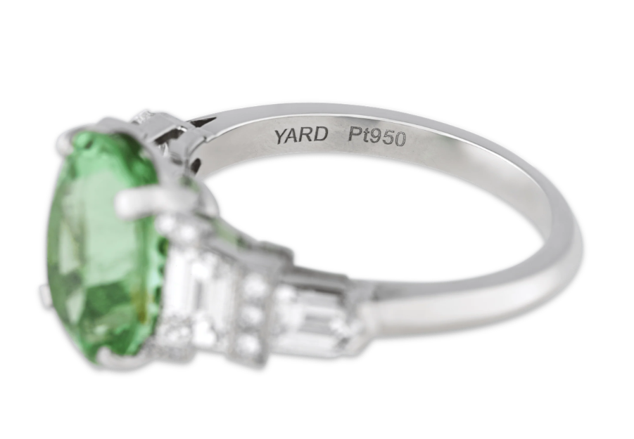 A green 3.65-carat Paraiba tourmaline centers this elegant ring from famed jeweler Raymond Yard This example originates in Mozambique and has no evidence of heat treatment Set in platinum with diamond accents